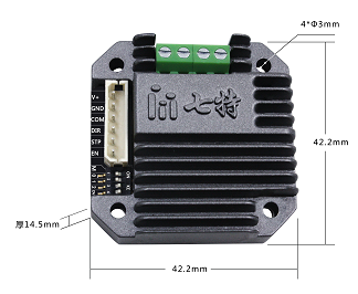 7TPSM4221是微型步进电机驱动器。其特点在于体积小,噪音小,保护功能完善。能直接固定在任意厂家的42步进电机上,提供0-1.7A电流,电源接口及控制线接口都支持热拔插。驱动器外壳为全铝合金铸件,坚固耐用,散热性能好,外观漂亮。